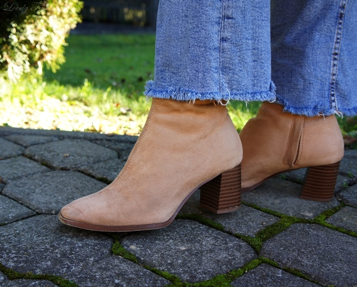 Cześć! :) W końcu mam dla Was nowy zestaw. Pierwsze skrzypce gra w nim liliowa, tweedowa marynarka. Została wykonana z grubszego materiału, ma taliowany krój, biżuteryjne guziki i przedłużaną długość. Pod nią wybrałam bawełnianą bluzkę z angielskim haftem, a do niej poszerzane dżinsy z wysokim stanem i skórzany pasek. Oba elementy pochodzą "z drugiej ręki". Dopełnienie ubioru stanowią botki z imitacji zamszu, torebka o nieregularnym kształcie oraz drobne kolczyki. Mam nadzieję, że podoba Wam się to połączenie. Życzę miłego wieczoru oraz udanej niedzieli! :)