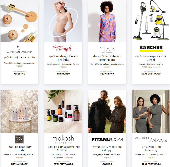 Cześć! :) Od dzisiaj do środy trwa kolejna akcja rabatowa pod hasłem "Szaleństwo zakupów". Kupony do salonów stacjonarnych znajdziecie w magazynach "Elle", "Glamour" oraz "Viva!". Natomiast poniżej, oprócz listy marek, biorących udział w tym przedsięwzięciu, zostawiam Wam kody zniżkowe do ich sklepów internetowych*. Życzę miłego wieczoru oraz udanych zakupów! :)