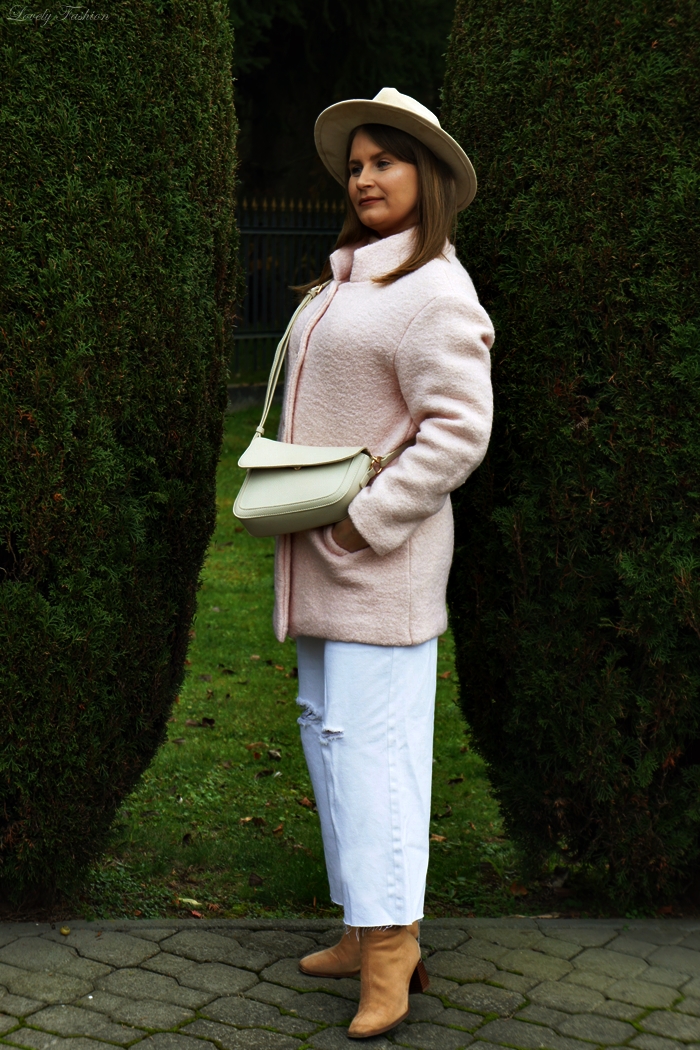 Cześć! :) Nareszcie prezentuję Wam nowy zestaw. Tym razem w pastelowej kolorystyce. Bazę stanowi tutaj półgolf z domieszką wełny i moheru. Dobrałam do niego grubsze, dżinsowe kuloty, skórzany pasek, a jako okrycie wierzchnie wybrałam wełniany płaszcz "z drugiej ręki". Urozmaiceniem jest kapelusz, a reszta to już nie raz przewijające się tutaj dodatki, czyli mleczna torebka, skarpetkowe botki oraz wyraziste kolczyki. Mam nadzieję, że podoba Wam się to połączenie.